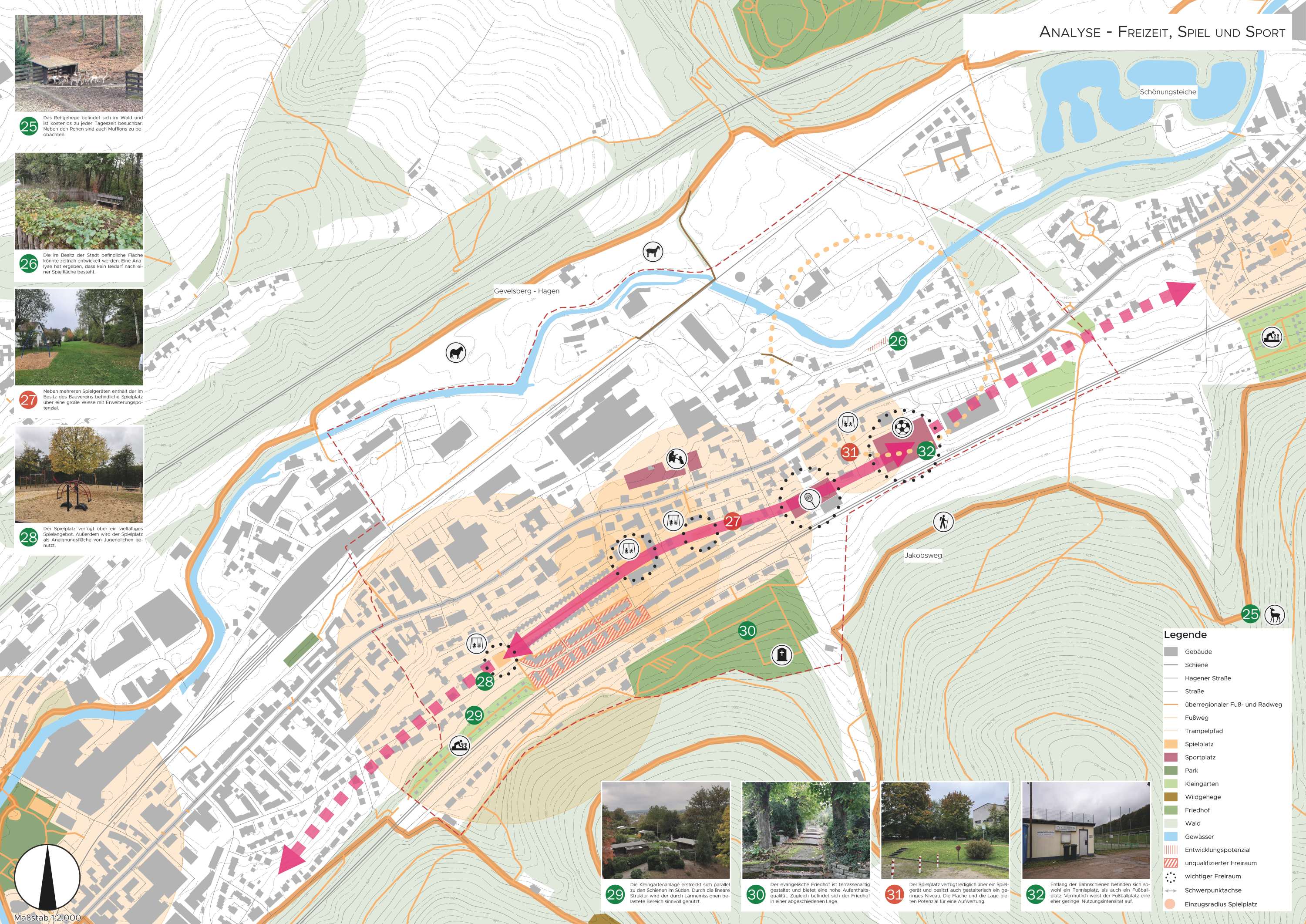 Anhand der Karte wird gut sichtbar, dass sich fast alle öffentlichen Freiräume in einer Bandstruktur zwischen der Hagener Straße und der ICE-Trasse befinden. Dazu gehören zwei Spielplätze, der Schulhof der Grundschule sowie die beiden Sportplätze (Tennis und Fußball). Im Westen ist zudem der Kleingartenverein angeschlossen. Die Wegeverbindungen zwischen den Nutzungen sind ausbaufähig, sind jedoch aufgrund der parallelen Lage zur Hagener Straße nur von geringem Autoverkehr geprägt. Langfristig ist eine Erweiterung der Achse nach Westen und Osten potenziell denkbar.