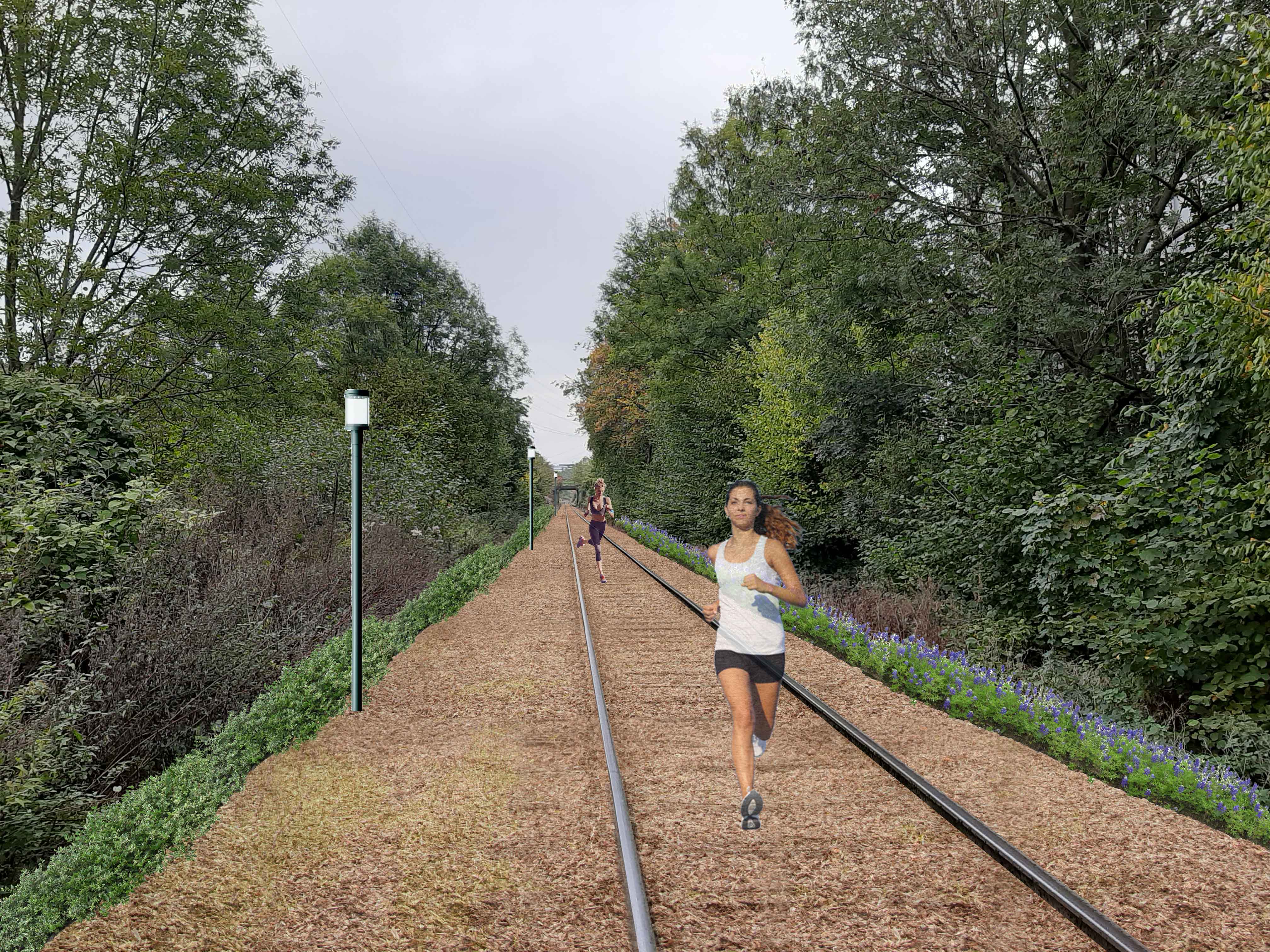 Eine außergewöhnliche Nutzung stellt die Talbahntrasse dar, welche als Zugverbindung erhalten bleiben soll. Aufgrund der geringen Frequenz – es verkehrt lediglich zweimal täglich ein Zug in geringem Tempo – soll die Trasse darüber hinaus jedoch auch als Freiraum dienen. Vorstellbar ist eine Joggingstrecke, welche mit Holzhackschnitzeln ausgelegt wird. Des Weiteren werden weitere Begrünungsmaßnahmen vorgesehen.