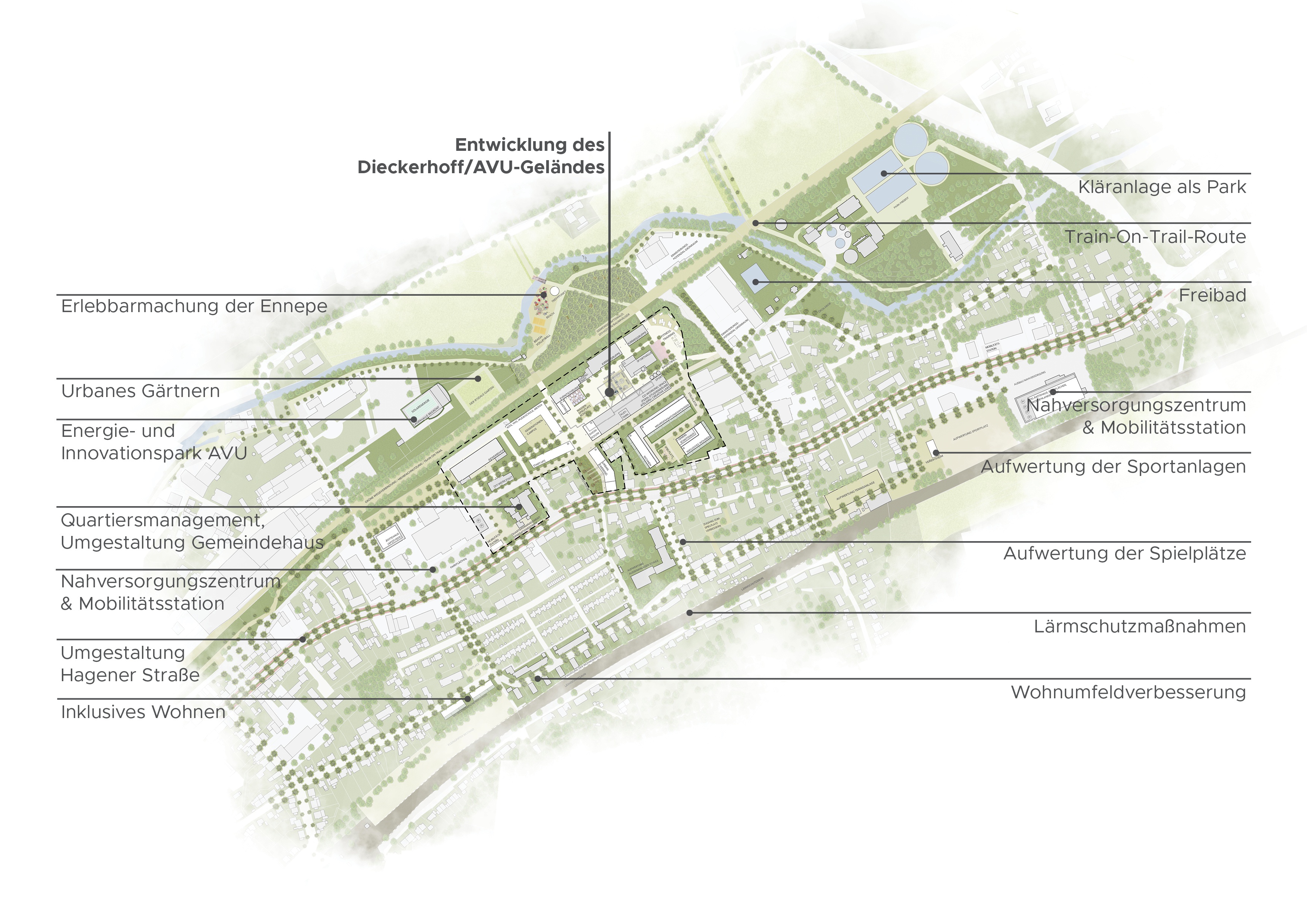 Grünkonzept dargestellt, werden diverse Verbindungen innerhalb des Stadtteils fußgängerfreundlich und barrierefrei ausgebaut. Die Verbindungen werden mit Alleen sichtbar gemacht; hierzu gehört beispielsweise die Brücke über die Ennepe, welche sich nördlich des Dieckerhoff-Geländes befindet.