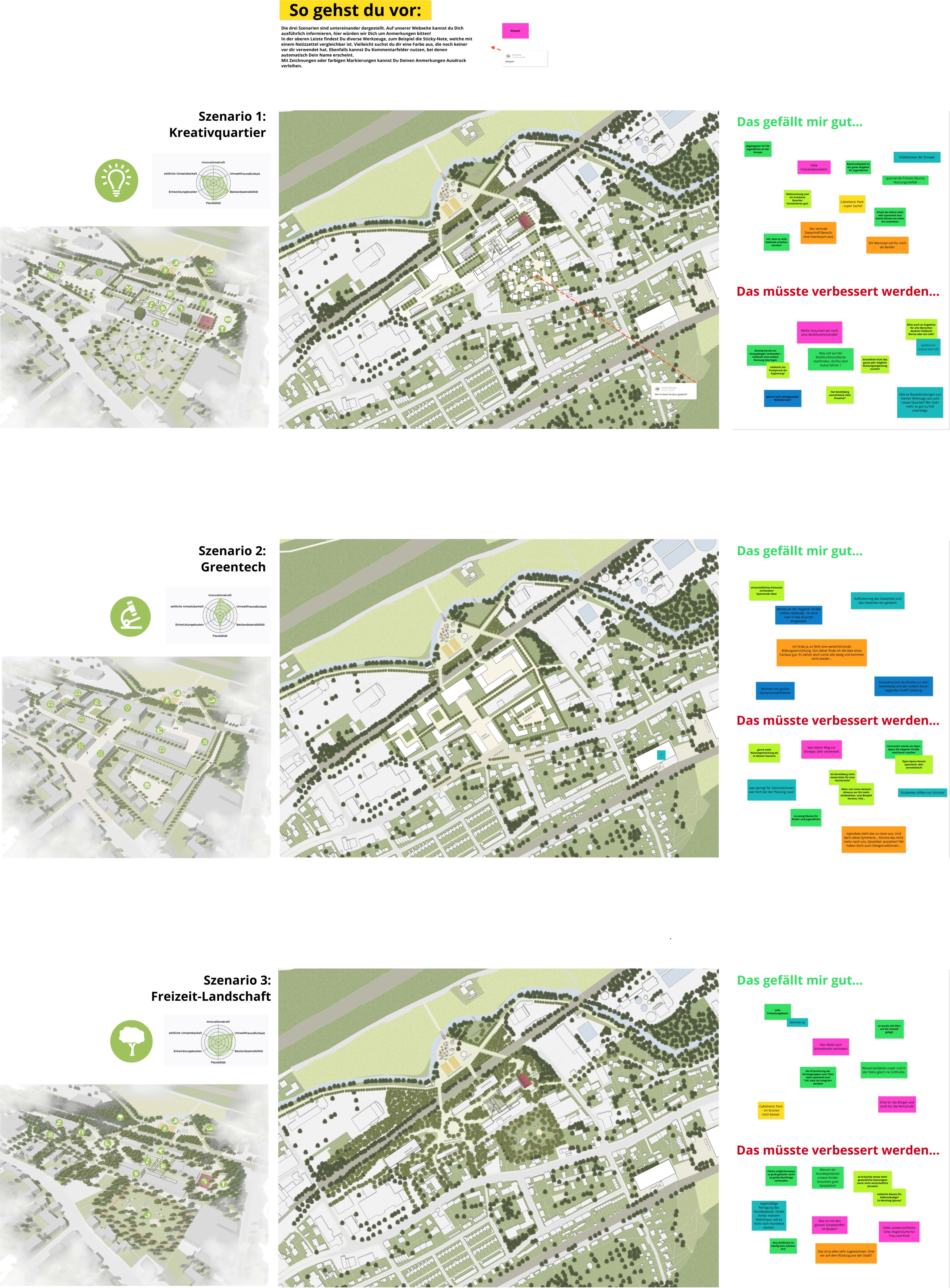 Baustein II der Beteiligung setzt sich mit der Zukunft des Dieckerhoff-Geländes auseinander; in diesem Kontext möchten wir ebenfalls den Baubetriebshof der AVU mitdenken, welcher sich westlich des Dieckerhoff-Geländes besteht. Auch weitere angrenzende Flächen wie die Hundespielwiese, das Gemeindehaus oder der Bereich an der Ennepe sollen ausdrücklich mitgedacht werden! Insgesamt haben die Flächen von Dieckerhoff sowie der Baubetriebshof der AVU eine Größe von 4,3 Hektar. Zur Beteiligung haben wir drei Szenarien erstellt, wie das Gelände theoretisch entwickelt werden könnte. Die drei Szenarien verfolgen verschiedene Ansätze und sollen eine Bandbreite an Möglichkeiten darstellen; die Entwürfe sind dabei bewusst „extrem“ gedacht; eine realistische Umsetzung steht hierbei nicht an erster Stelle. Im Beteiligungsprozess soll stattdessen geprüft werden, welche Aspekte der einzelnen Szenarien von Euch positiv bewertet werden. Was gefällt dir? Was sollte noch verbessert werden? Gerne darfst du auch neue Nutzungswünsche einbringen - zwischen einer allgemeinen Idee und konkreten Nutzungswünschen sind dir keine Grenzen gesetzt! Hierzu hatten wir einen externen Link zu conceptboard.com integriert, bei dem Du dich kreativ entfalten konntest.