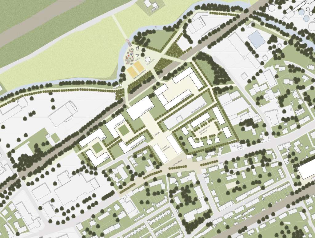 Der südöstliche Wohnbereich soll primär studentisches Wohnen beinhalten. Ergänzend werden jedoch auch weitere temporäre Wohnformen wie Co-Living angeregt. Der große Platz in der Mitte dient der sozialen Interaktion; die privaten Gärten sind dagegen vergleichsweise klein. Auf dem Platz sind beispielsweise bewohner*innengetragene Landwirtschaftsformen vorstellbar.