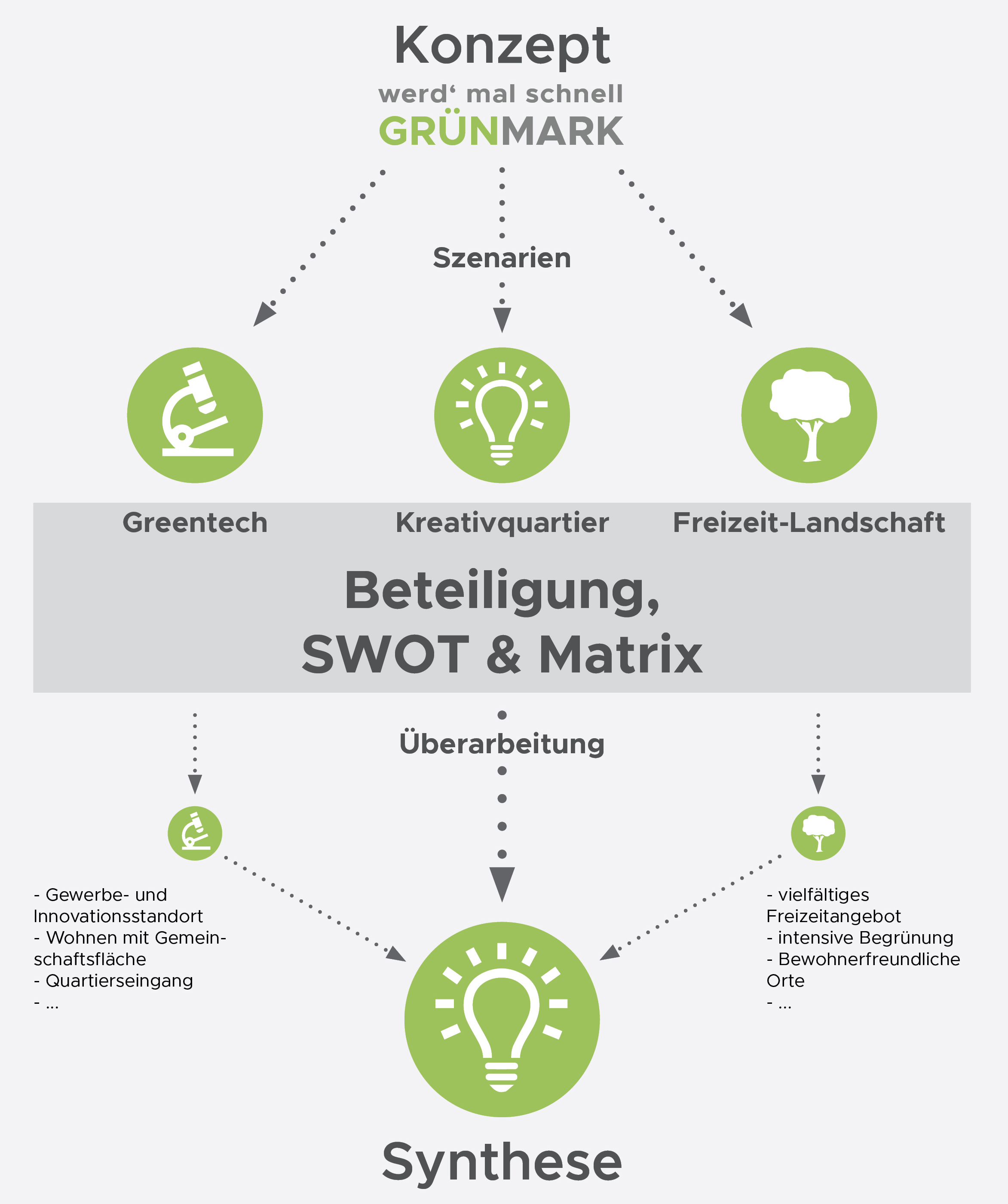 Die Synthese basiert auf der Auswertung der Szenarien anhand der Beteiligung sowie einer SWOT-Analyse. Hierbei wuchs die Erkenntnis, dass alle drei Szenarien positive Inhalte besitzen, die es gilt, in der Synthese zu integrieren. Zugleich wurde das Szenario des Kreativquartieres in der Beteiligung als auch in der SWOT-Analyse am positivsten bewertet. Daher wurde dieses als Grundlage genutzt, in welches die anderen Szenarien mit einfließen.