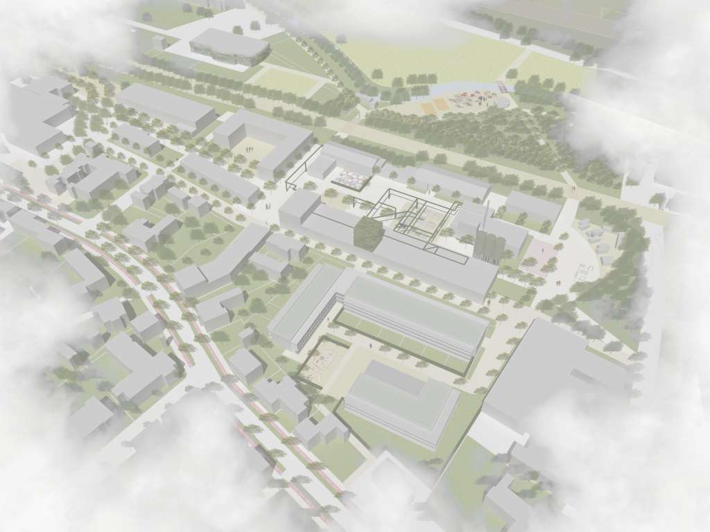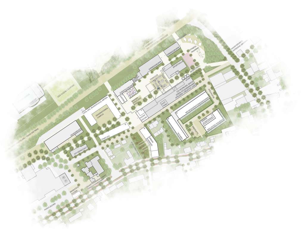 Im Westen entsteht auf der Fläche des AVU-Geländes ein gewerblicher Schwerpunkt, im Osten auf der ehemaligen Dieckerhoff-Fläche ein kreatives und aktiver Bereich. Da sich der westliche Teilbereich im Besitz der AVU befindet, welche derzeit keine Absichten verfolgt, ihren Betriebshof aufzugeben, stellt die Seite eine Option für die Zukunft dar. Die Entwicklung des östlichen Dieckerhoff-Raumes kann dagegen zeitnah eingeleitet werden, da die Fläche durch die Insolvenz des Unternehmens nicht genutzt wird. Von dem Mittelpunkt gehen in alle Richtungen fußläufige Wege ab, welche durch prägende Alleen eingerahmt werden.