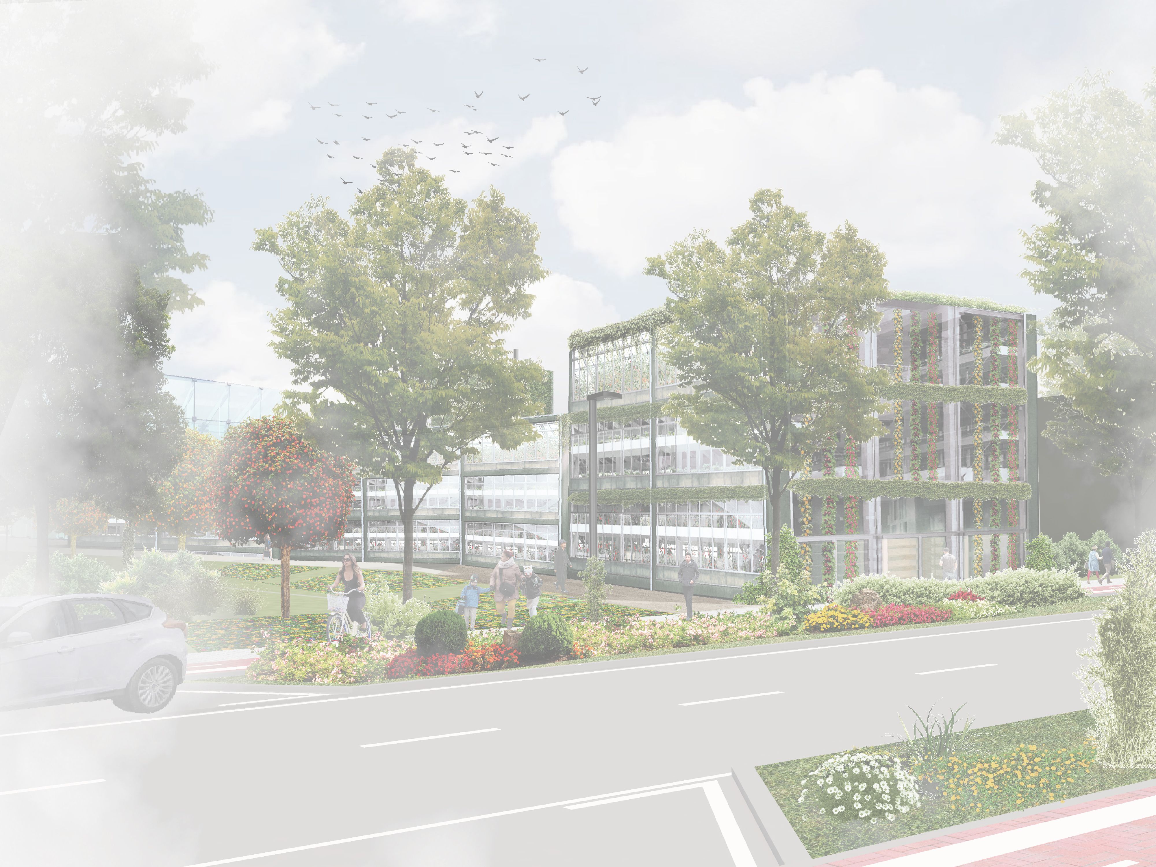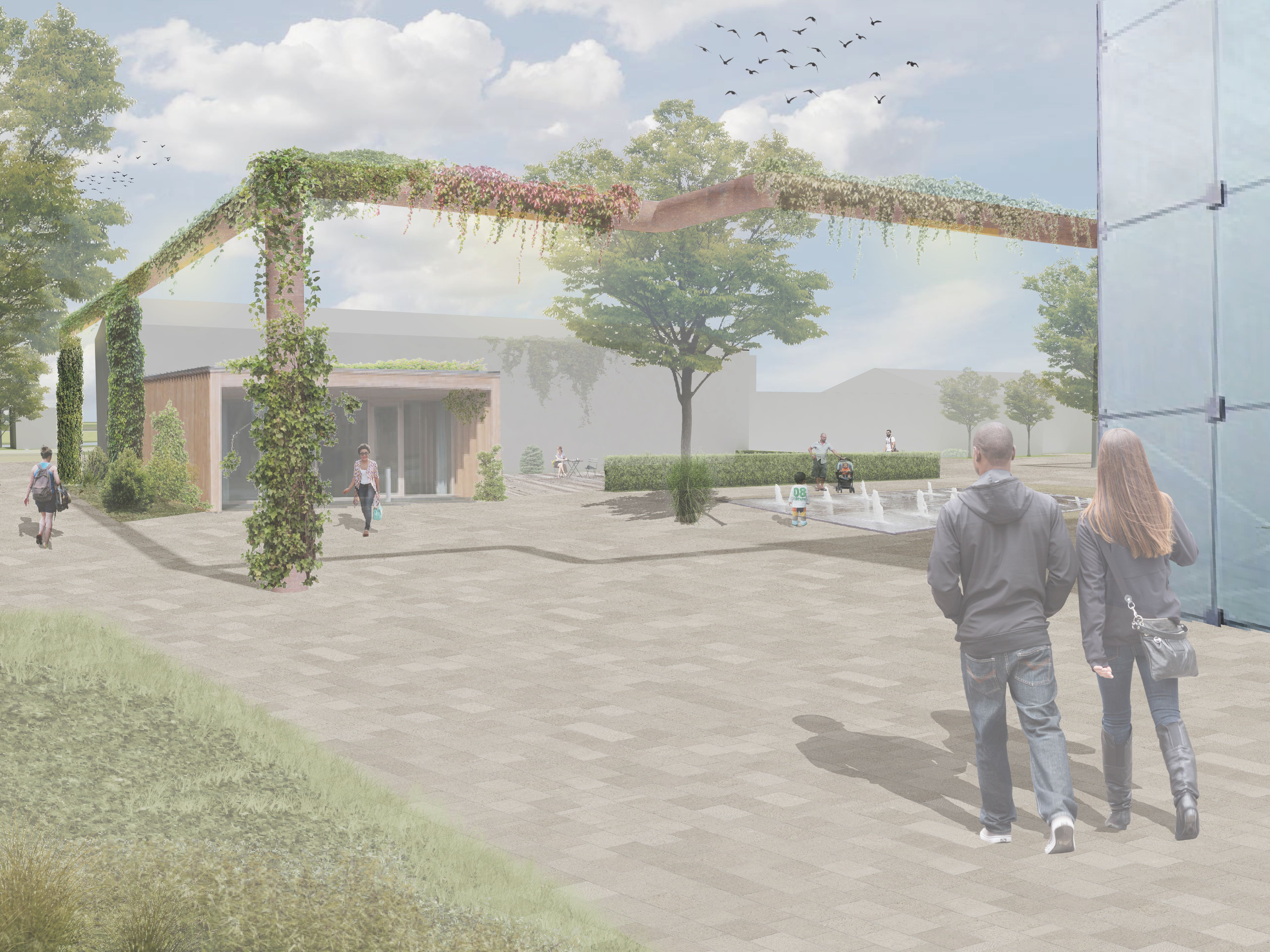 Das neue Quartier beginnt mit einem prägnanten Gebäude an der Hagener Straße: neben einem fußläufigen Eingang schmiegt sich ein längliches Gebäude mit urbaner Landwirtschaft – die Produktion wird hierbei durch eine Verglasung des Gebäudekörpers sichtbar gemacht. Entlang des Gebäudes wird man auf einen Quartiersplatz geführt, an dem sich das Gelände teilt.