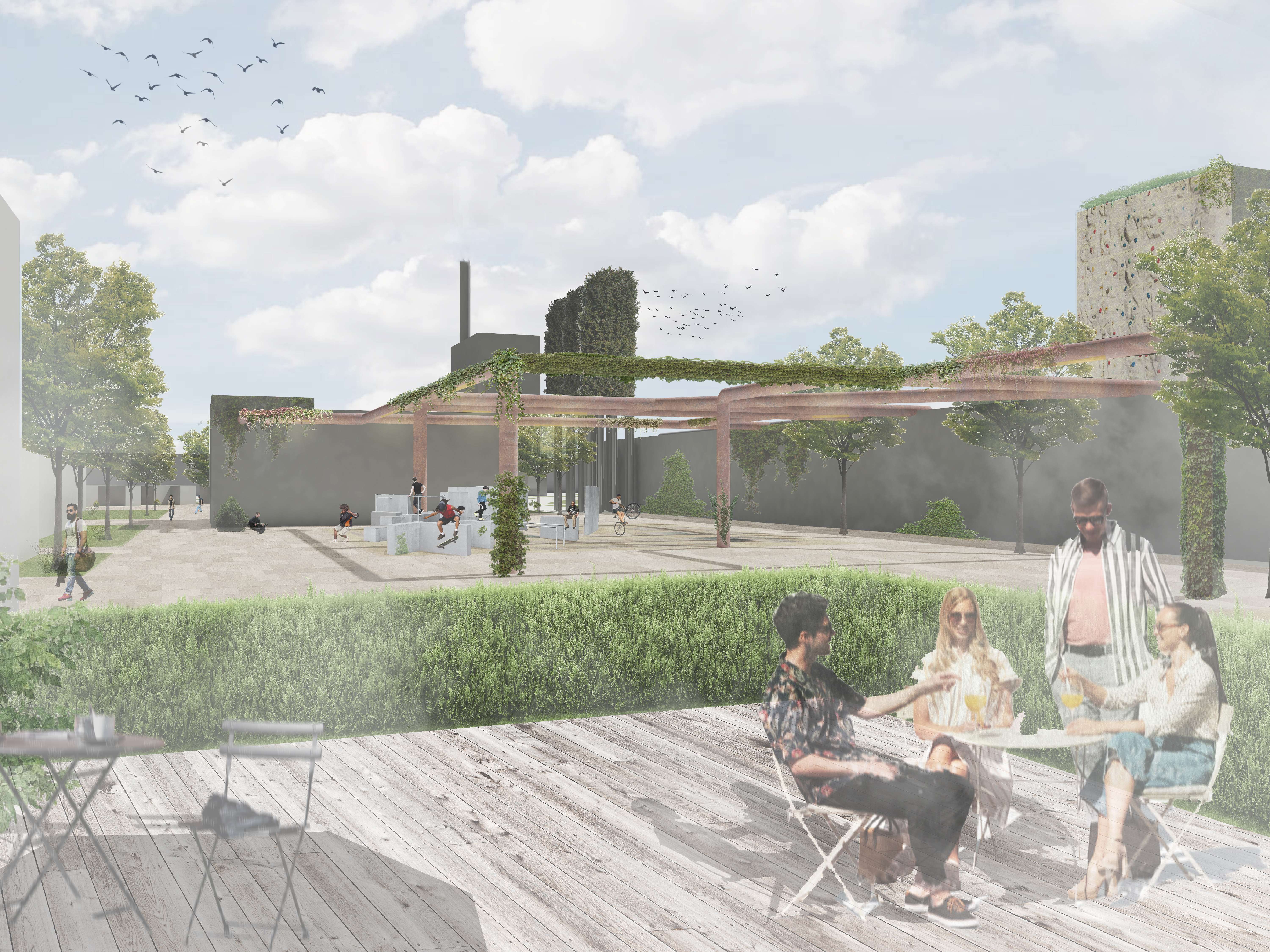 Im Norden wird der Platz durch diverse öffentliche Nutzungen eingerahmt, welche sich hauptsächlich in umgenutzten alten Industriegebäuden befinden. Auf den Platz gehend befindet sich zuerst ein Gastrobereich, der an eine „Eventscheune“ angegliedert ist. Die ehemalige umgenutzte Halle kann zum Beispiel für Märkte und Streetfood-Veranstaltungen dienen und wird durch einen Platz für Außengastronomie eingefasst. Daneben befindet sich ein Jugendtreff, welcher räumliche Bezüge zur gegenüberliegenden Parkouranlage herstellt.